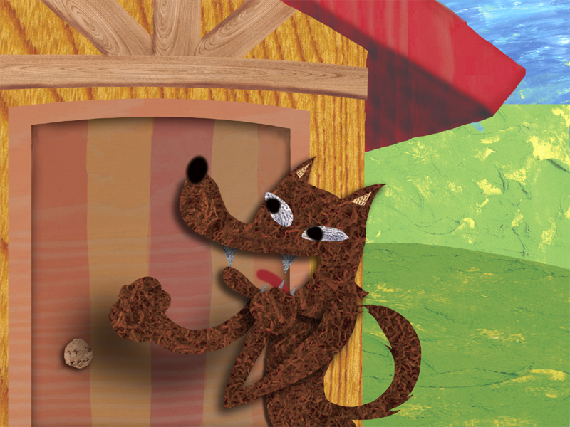 オオカミは おばあさんの いえの ドアを たたきました。