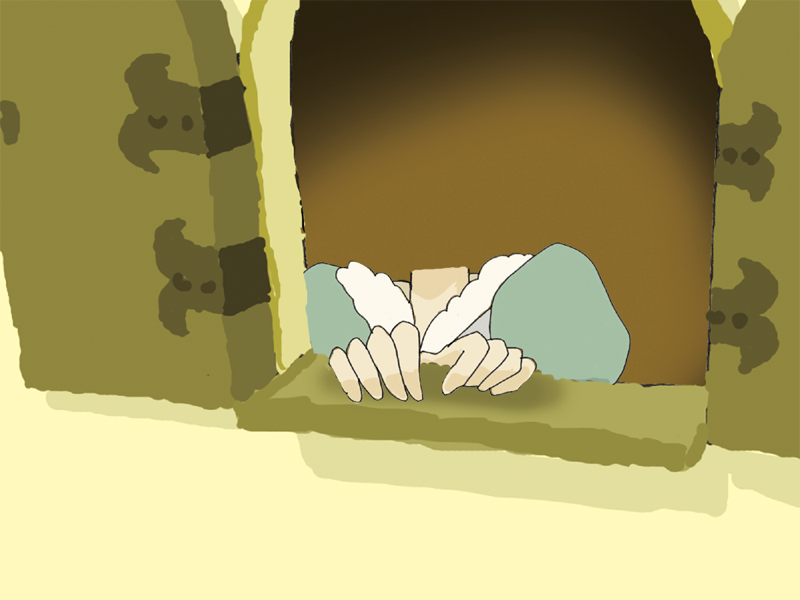 ひとりの けらいが つまづいて、ひつぎが おおきく ゆれました。
