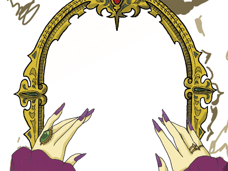 おきさきは、ふしぎな まほうの かがみを もっていました。