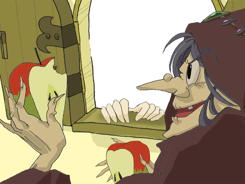 おきさきは、ひみつの へやで どくりんごを つくりました。
