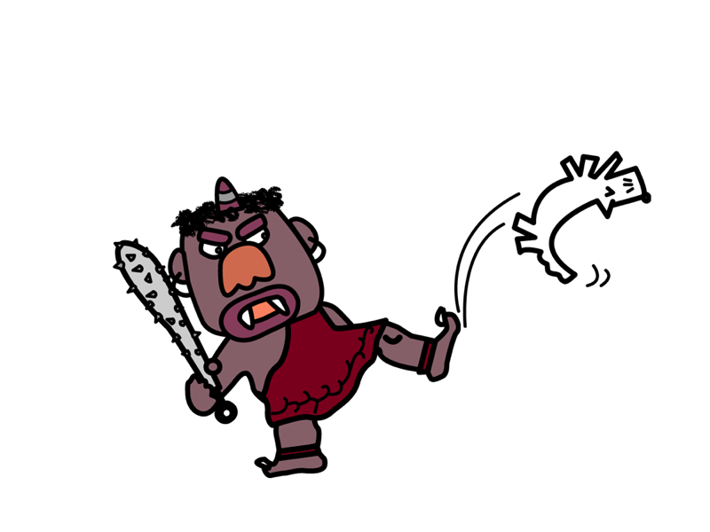 いぬは、わんわん ほえながら、おにの 足に かみつきました。